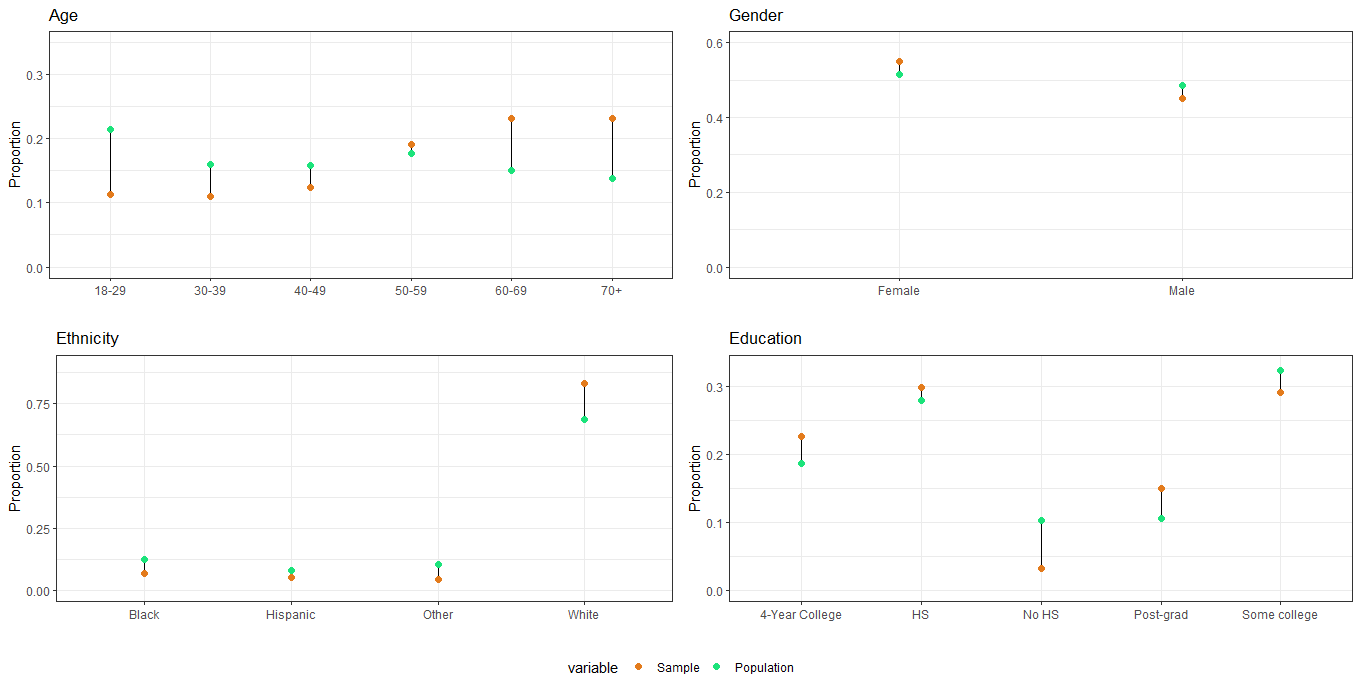 For this exercise, we assume that the non-probability sample (NPS) was collected through social media advertisements. This approach introduces potential biases because only individuals with internet access and who are active on the specific social media platform could participate. Consequently, the NPS may suffer from both self-selection bias and coverage bias (since the sample is restricted to those with internet access and a presence on social media).